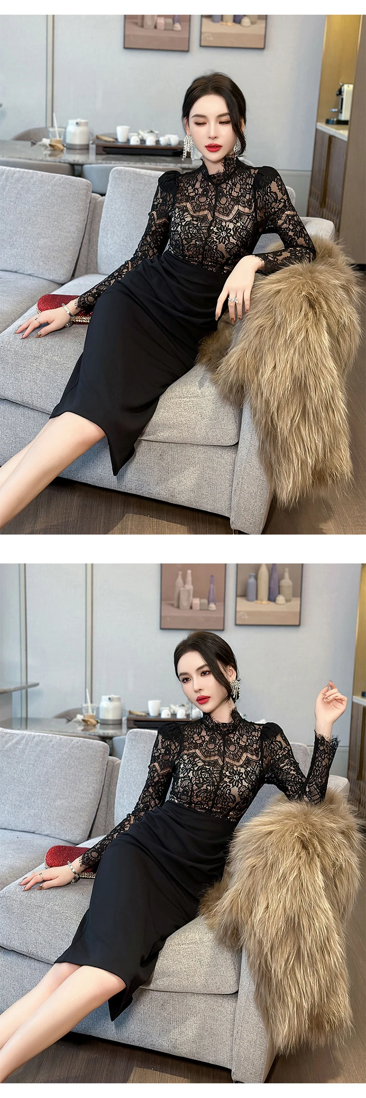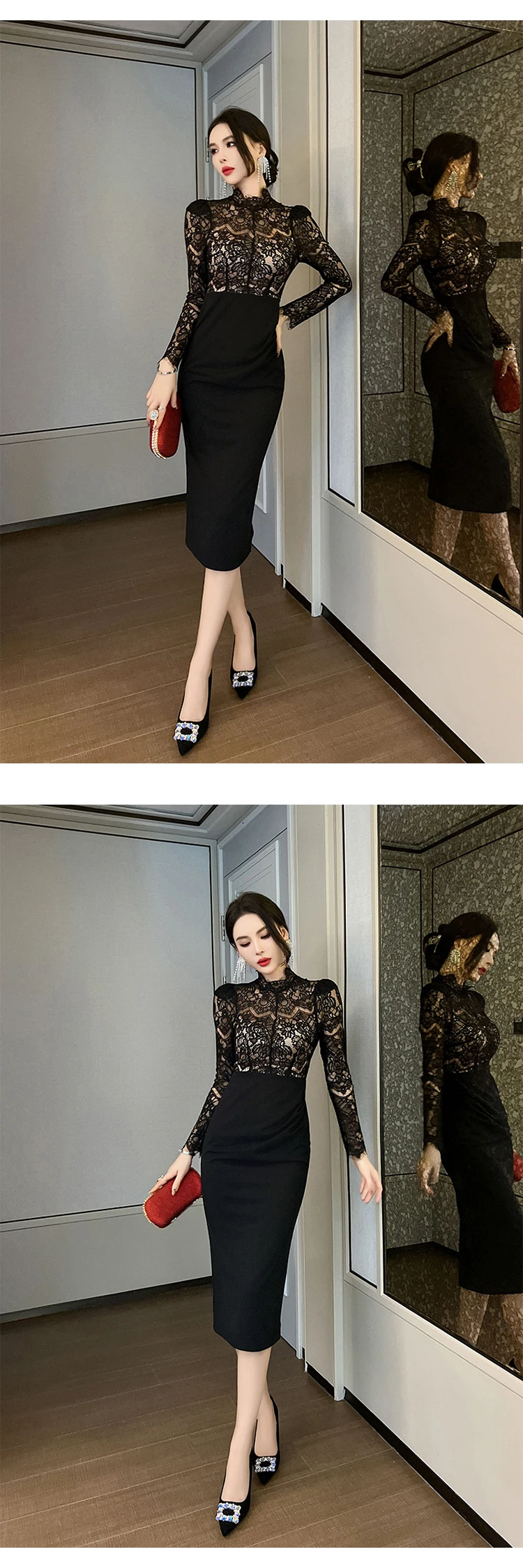 New Women's French Elegant Black Dress Celebrity Sheer Lace Spliced Midi Robe Professional Business Vestidos Mujer Party Gown