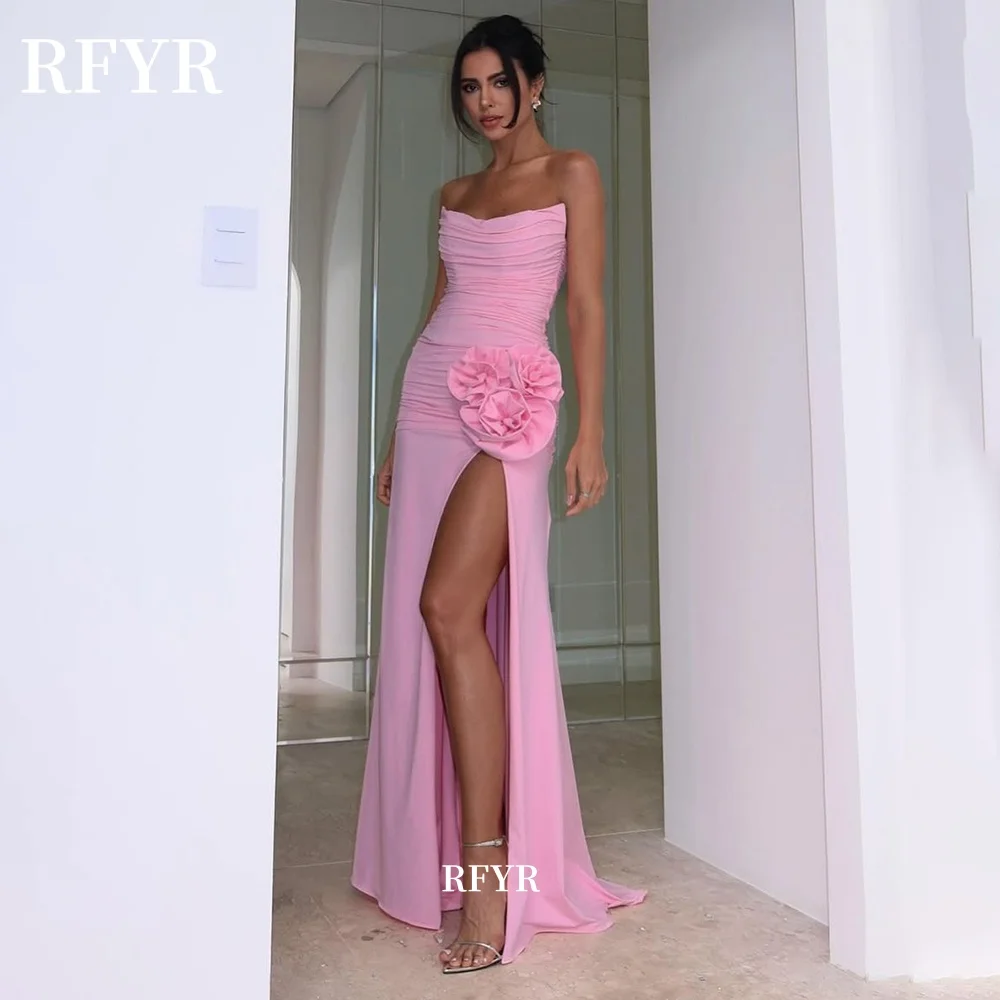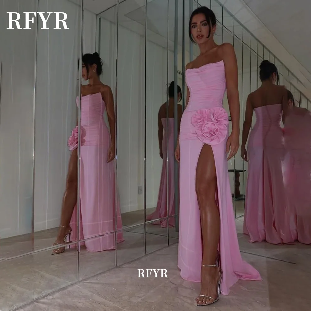 RFYR Chiffon Prom Dress Strapless Party Dress 3D Flowers Evening Dress Pleats Formal Party Dress with Slit Vestidos De Noche