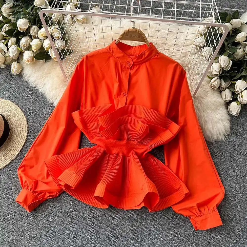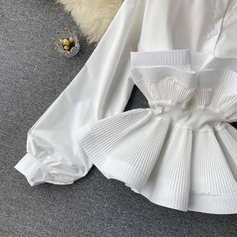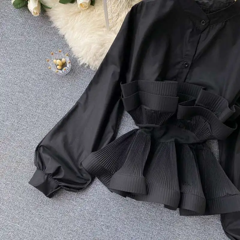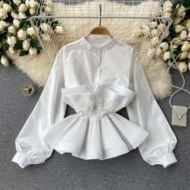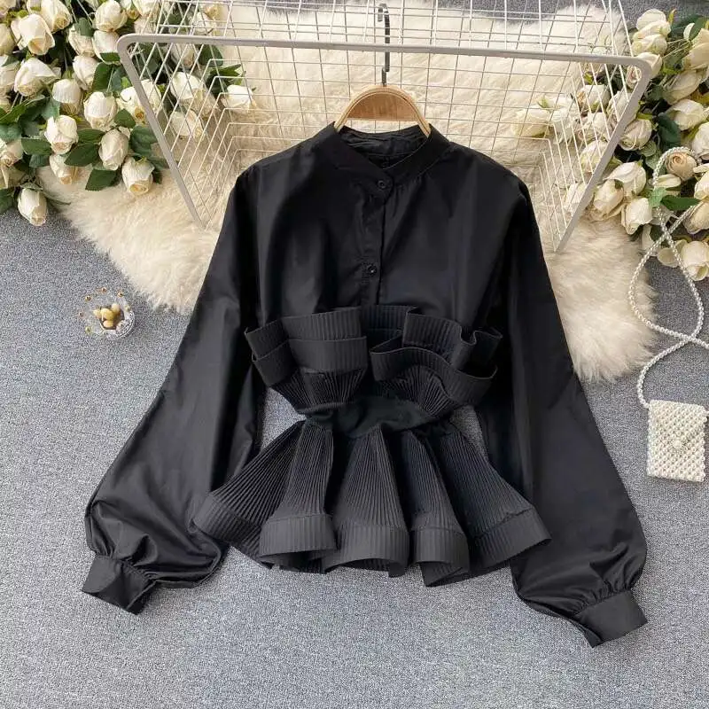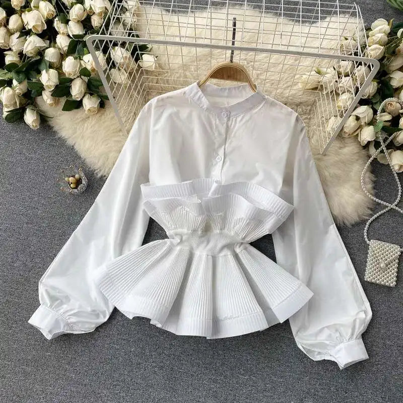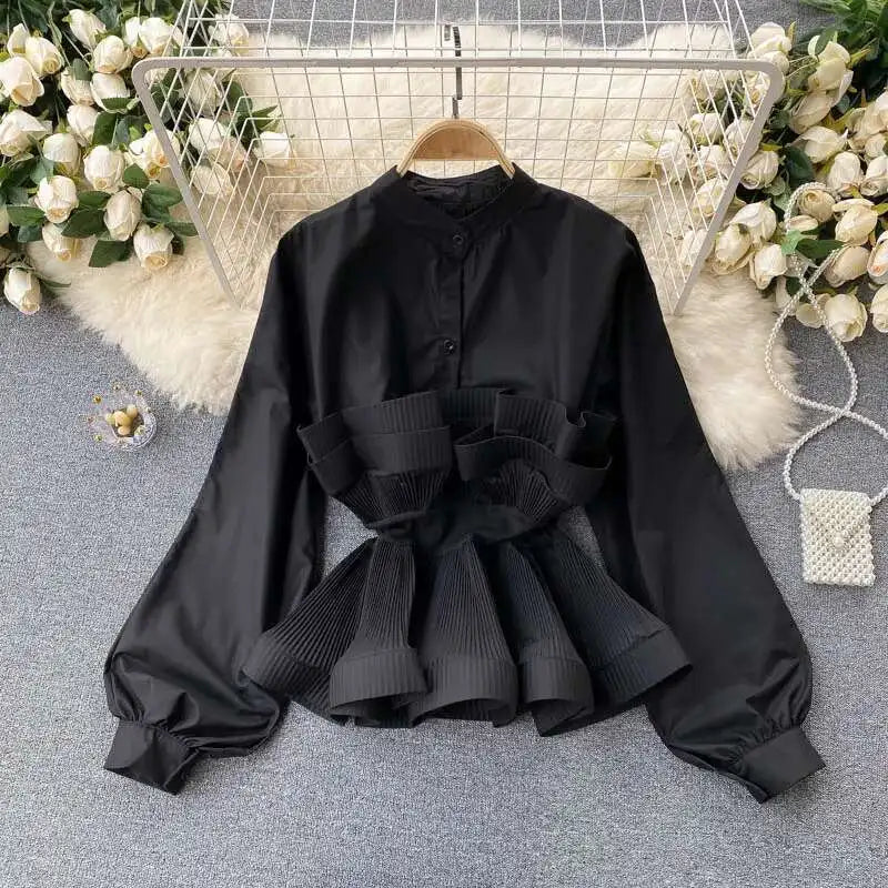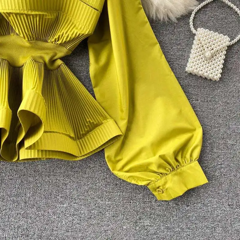 XFPV Women Puff Sleeve Pleated Ruffle Solid Casual Blouse Patchwork Y2k Top Slim Waist Shirt Sweet Summer Spring 2025 SM2983