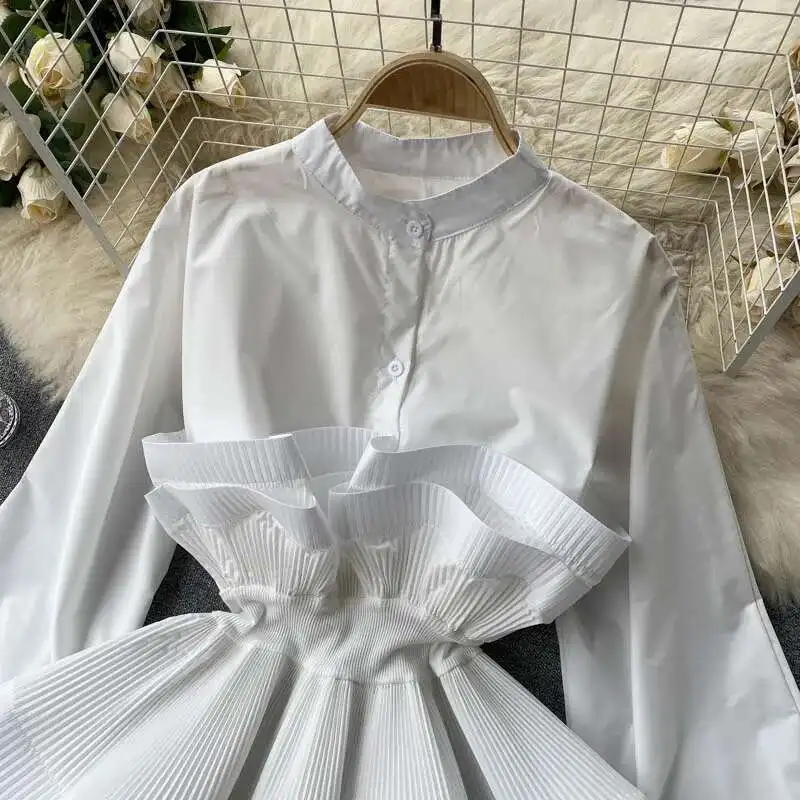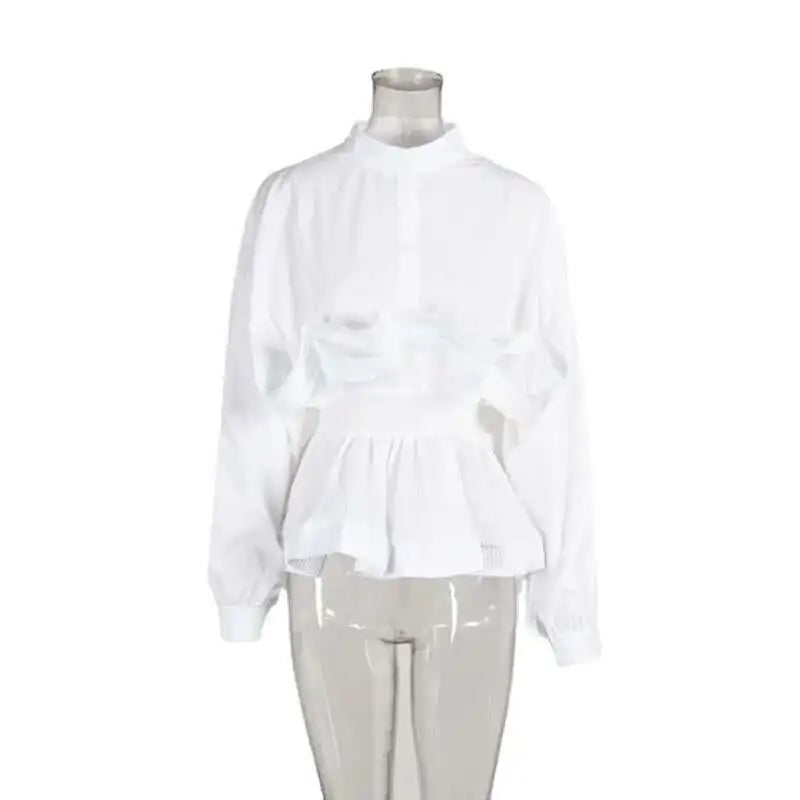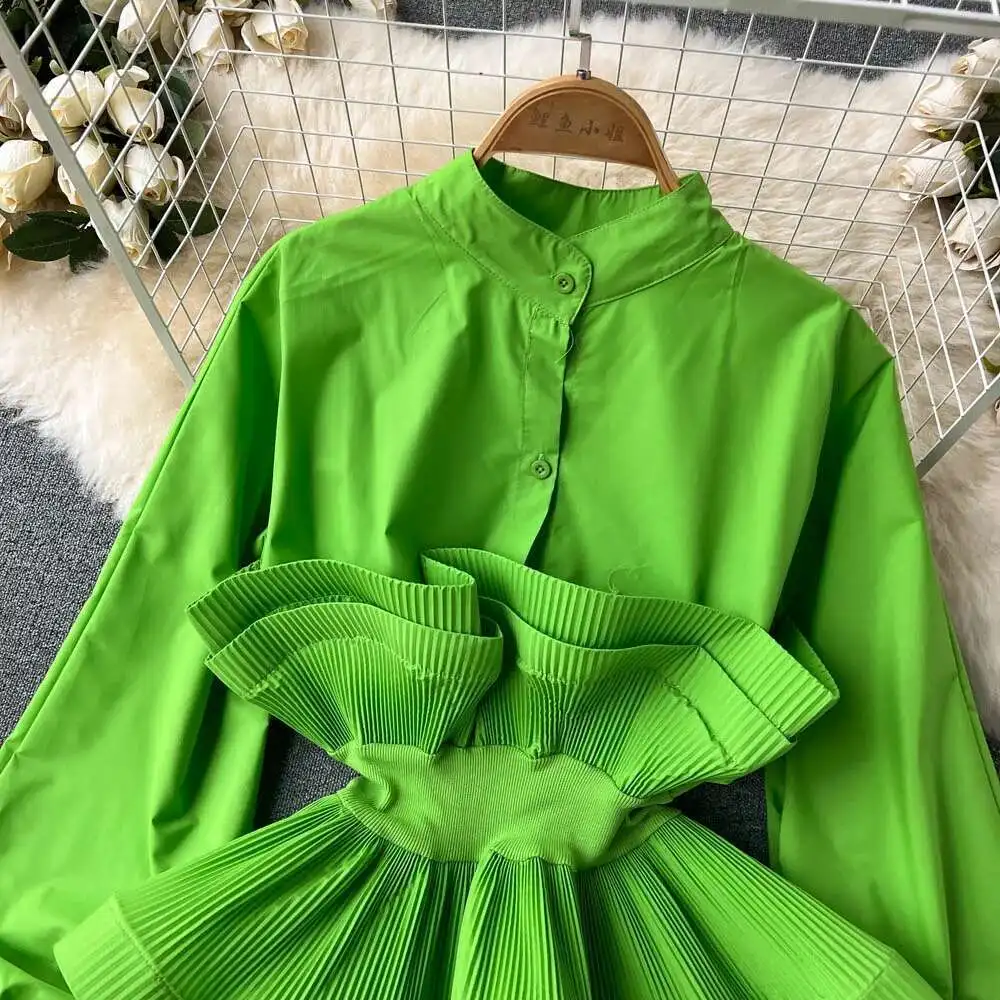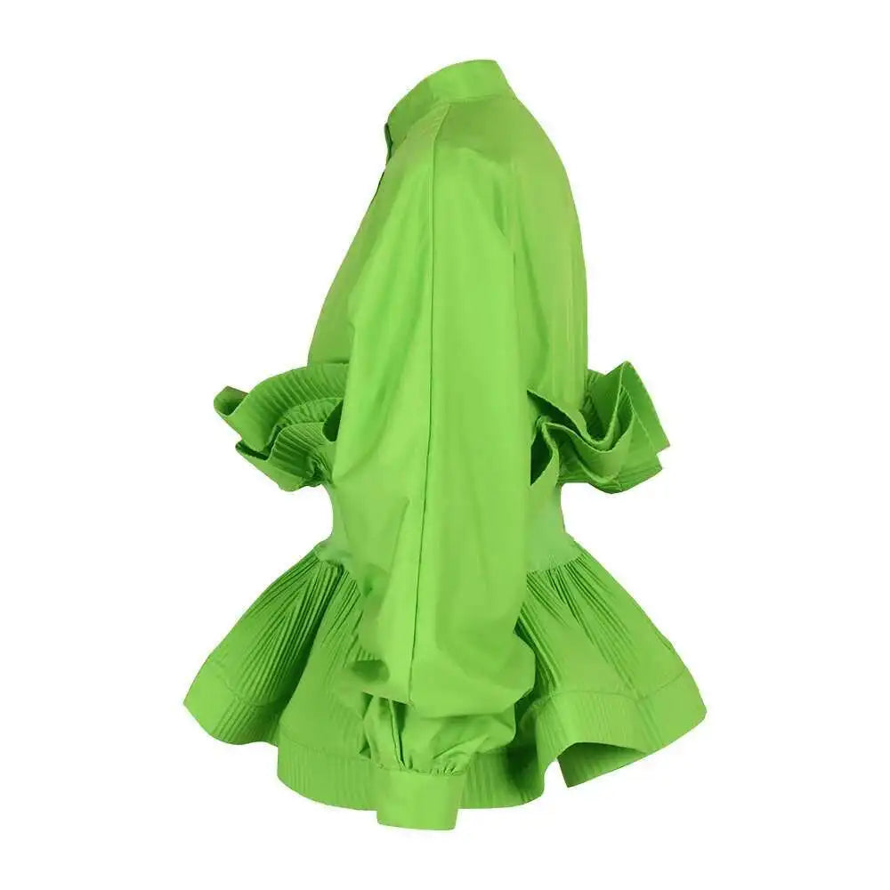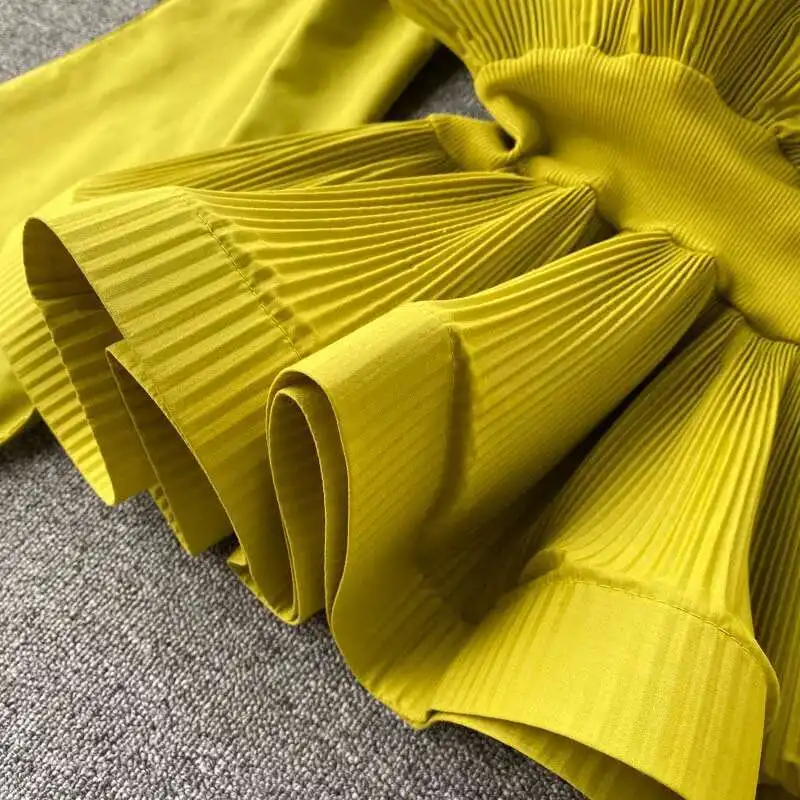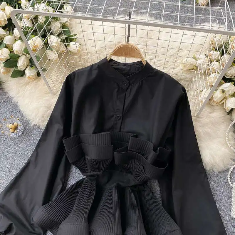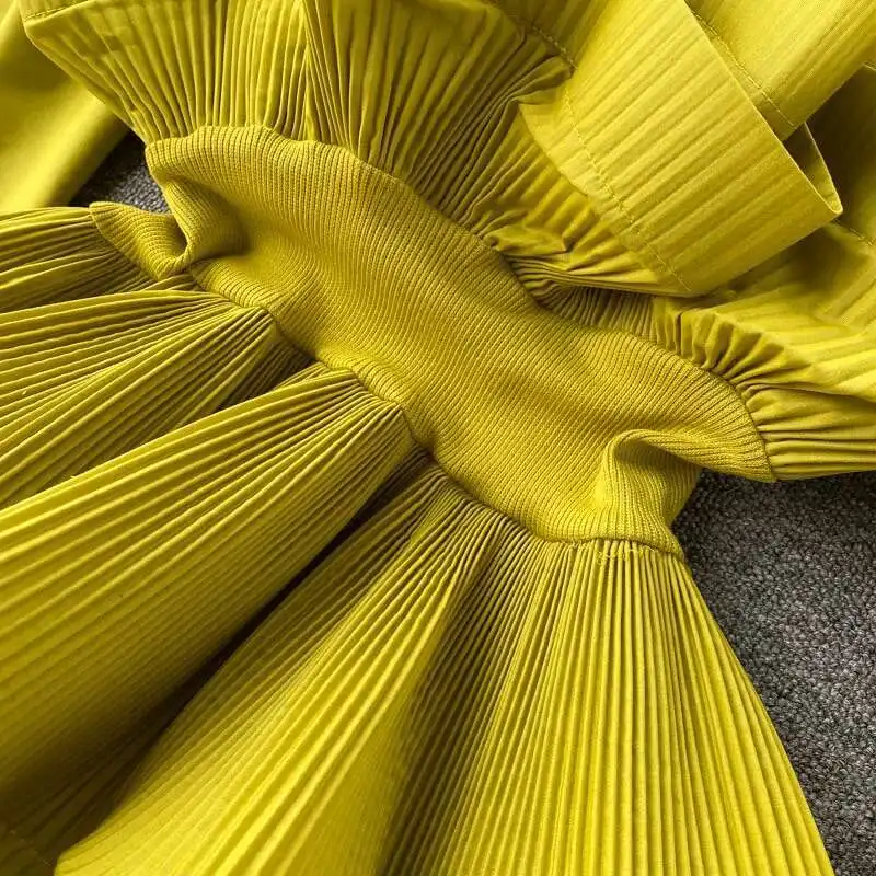 XFPV Women Puff Sleeve Pleated Ruffle Solid Casual Blouse Patchwork Y2k Top Slim Waist Shirt Sweet Summer Spring 2025 SM2983